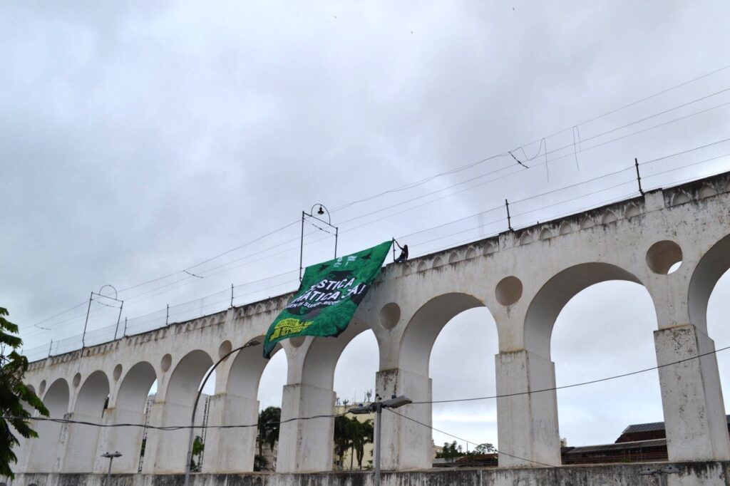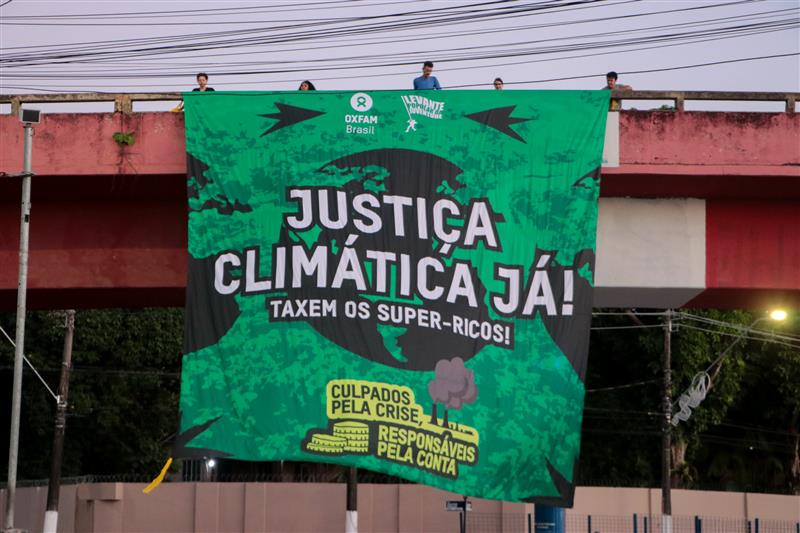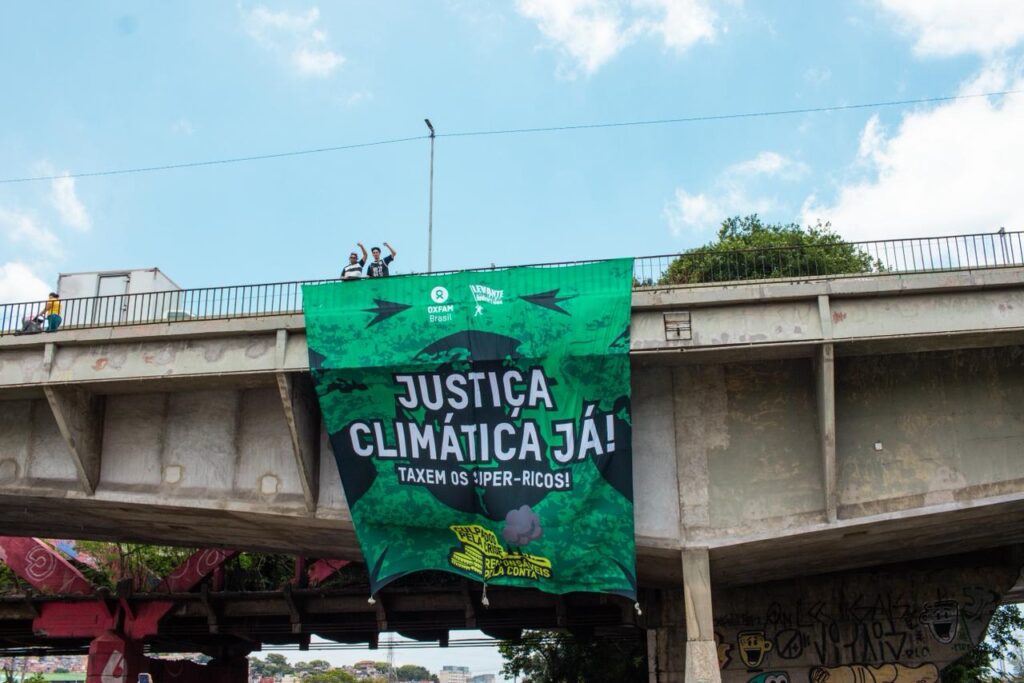 Na segunda-feira (10), o amanhecer em Belém, Brasília, Rio de Janeiro e São Paulo foi marcado pelo ato “Amanhecer Pelo Clima”. No Elevado Carlos Marighella, ativistas estenderam um bandeirão com os dizeres “Justiça Climática Já!”, “Taxem os super-ricos!” e “Culpados pela crise, responsáveis pela conta”. A ação destacou o impacto desproporcional dos mais ricos na crise do clima e a necessidade urgente de taxar essa parcela para financiar a justiça climática.
