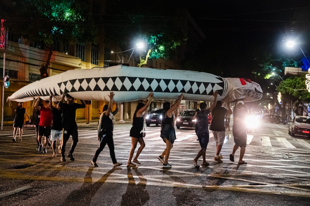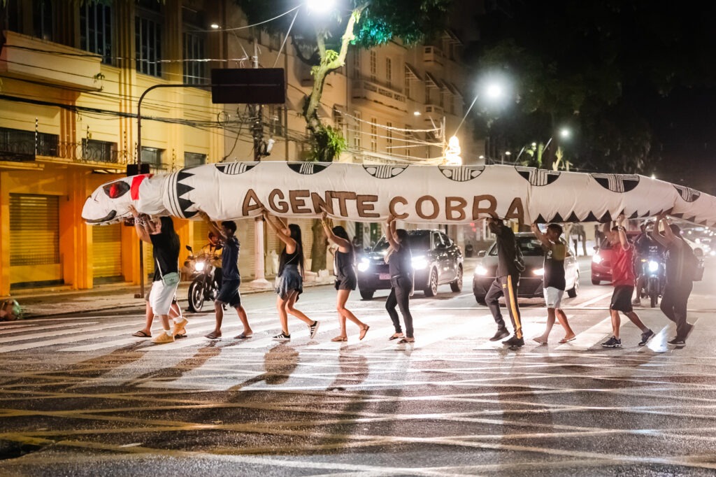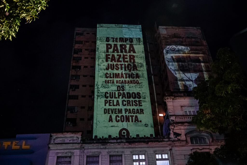 Já no período da noite, ao encerrar o primeiro dia de negociações oficiais da COP30, as organizações realizaram uma projeção em um prédio na Avenida Presidente Vargas. A imagem de um globo terrestre dentro de uma ampulheta, com a areia caindo, ilustrava a mensagem de que o tempo para a justiça climática está se esgotando. A projeção foi acompanhada por uma cobra cenográfica, reforçando o slogan “A gente cobra”, utilizado pela Aliança para exigir participação popular nas decisões e a taxação de grandes fortunas para o financiamento climático.
