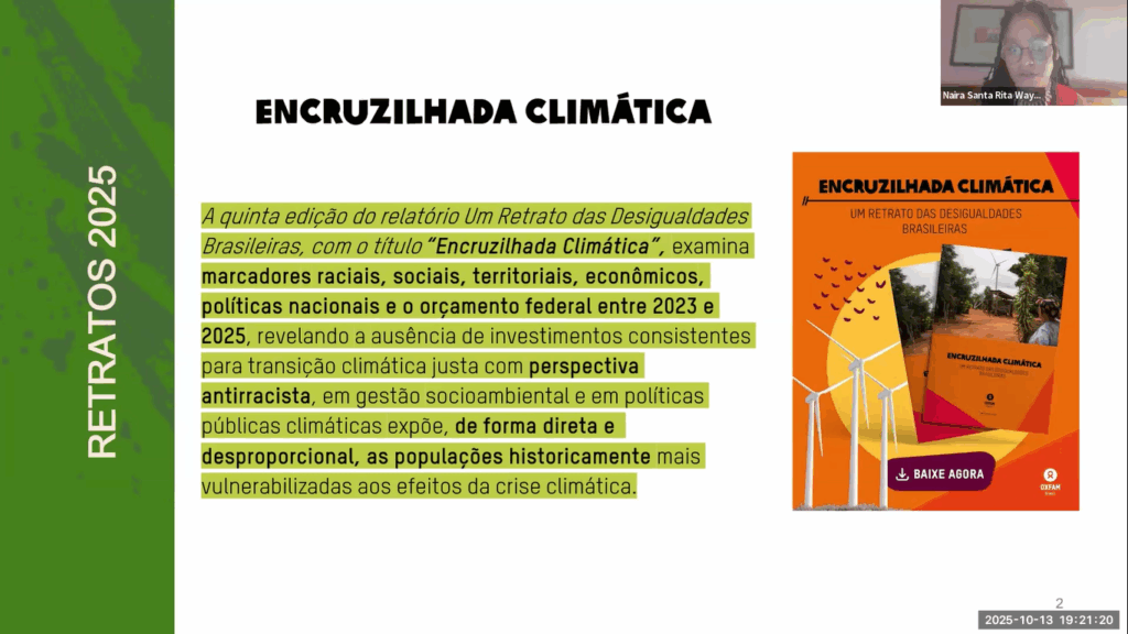 Naira Santa Rita, coordenadora da área de Justiça Climática e Amazônia, apresentou as conclusões alarmantes do relatório, divulgado um mês antes da realização da COP30 em Belém, e iniciou sua explanação detalhando como os impactos climáticos atinge prioritariamente a população brasileira em situação de mais vulnerabilidade.